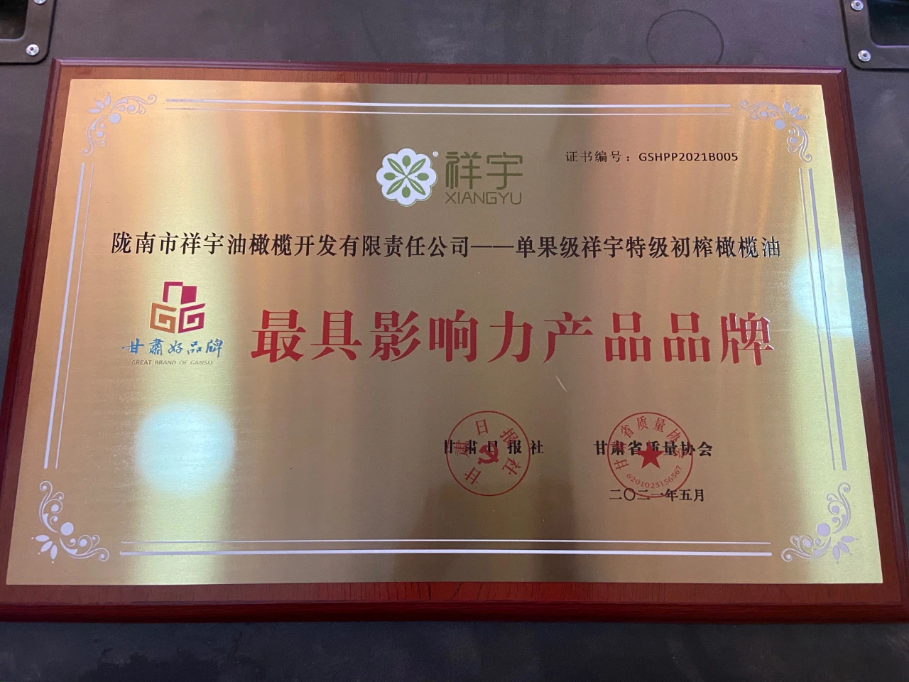 5月15日“第二屆甘肅品牌論壇”在蘭州舉行。祥宇單果特級初榨橄欖油榮獲2021“甘肅好品牌”最具影響力產(chǎn)品品牌。